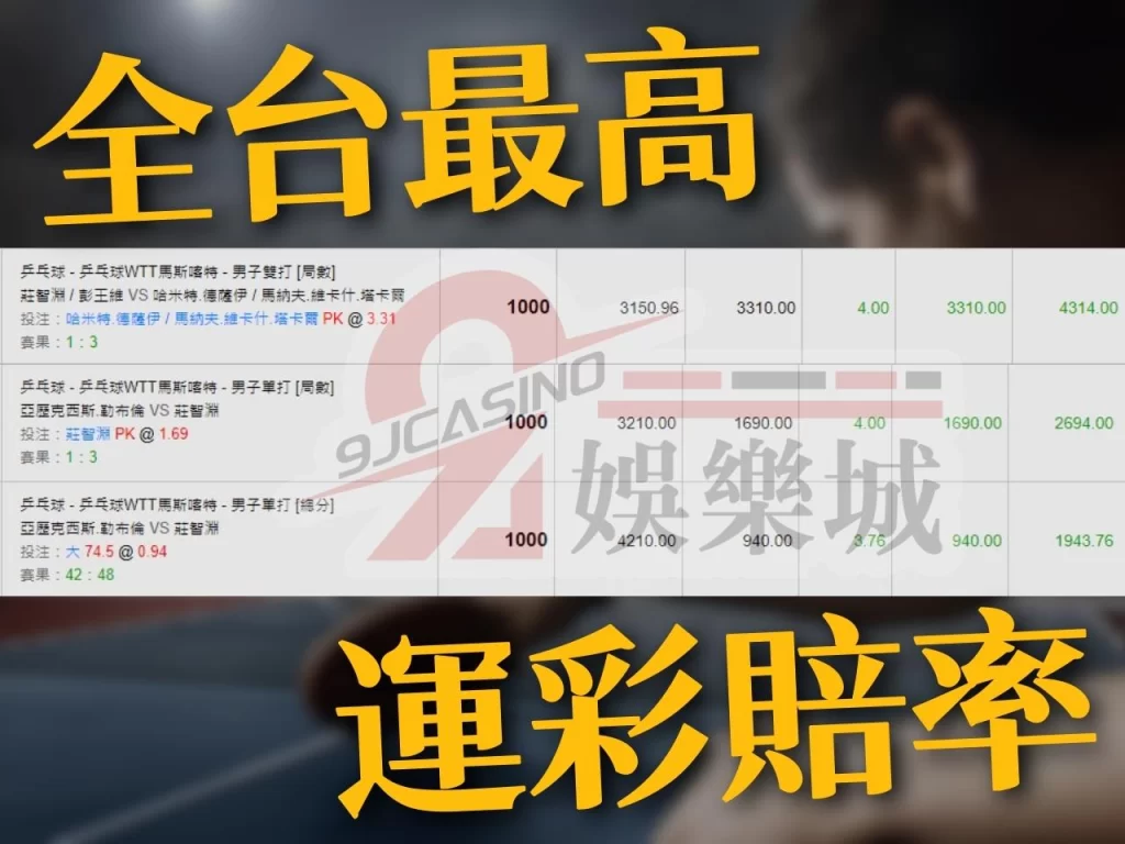 上面有提到過,現在多數人在進行桌球運彩投注都是透過台灣運彩或是《9J娛樂城》的乒乓球運彩盤口。