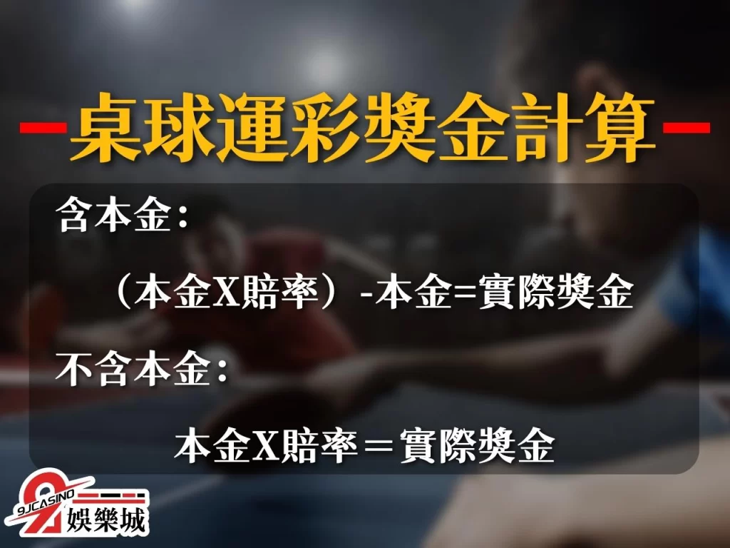 而台灣運彩所使用的桌球運彩賠率是「含本金」的,所以當我們以含本金的桌球運彩賠率與本金相乘後的結果,還要扣除到原先投注的金額,才能算是實際賺到的金額。