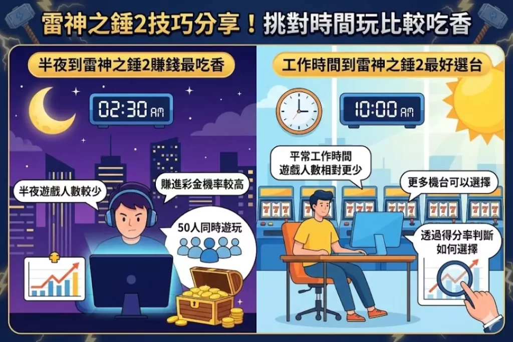 雷神之錘2技巧中還有針對時間來去打,這裡針對半夜的時間比較吃香,因為半夜的遊戲人數其實相對晚上來說少很多,這樣要賺進彩金的機率就會比較高,試想同一個時段100個人同時遊玩跟50個人同時遊玩,那麼你會在哪個時間比較容易賺進獎金?不用多想就是50人的時段!